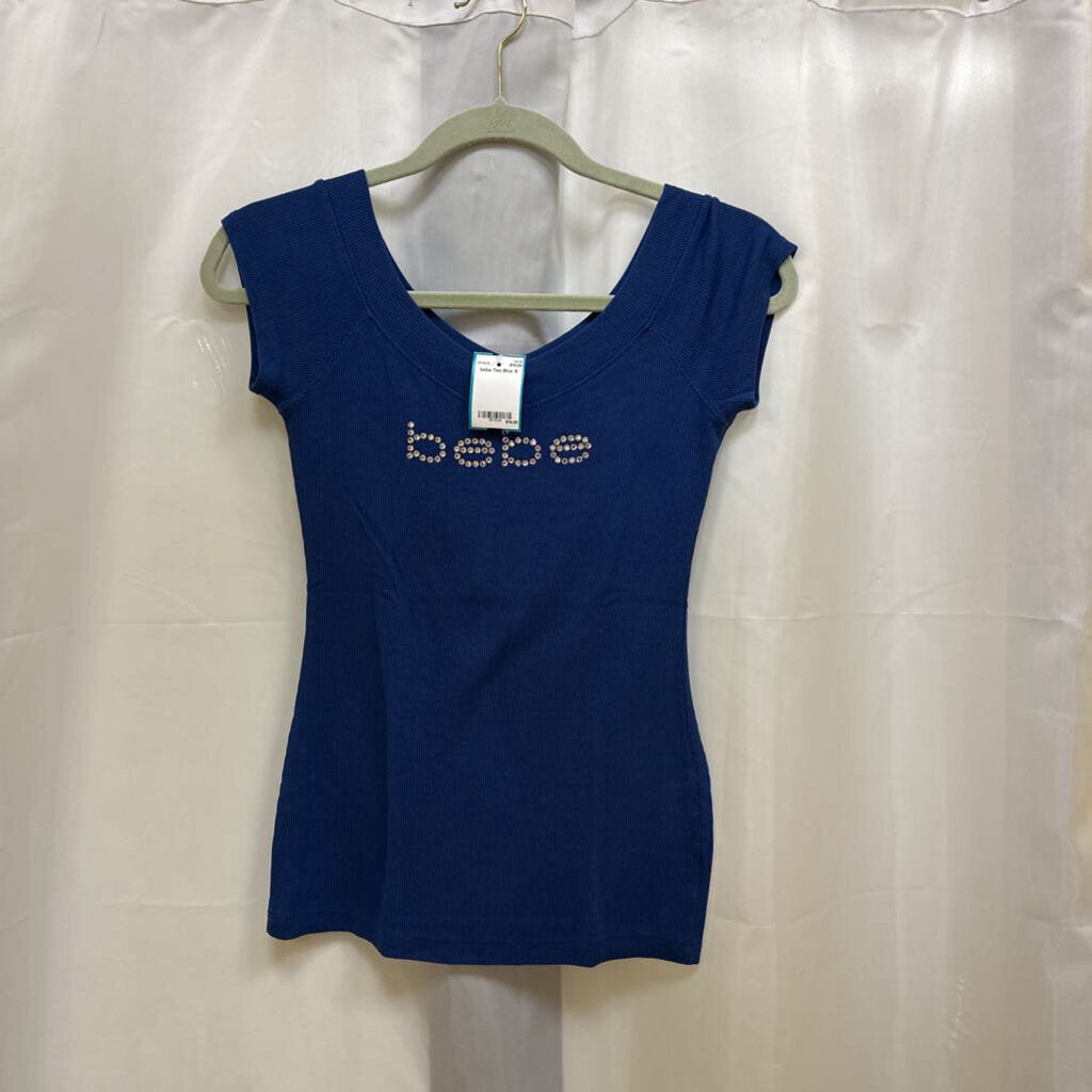 Cap raglan sleeve rib knit pull over tee with low V- necklines and rhinestone logo front accent.