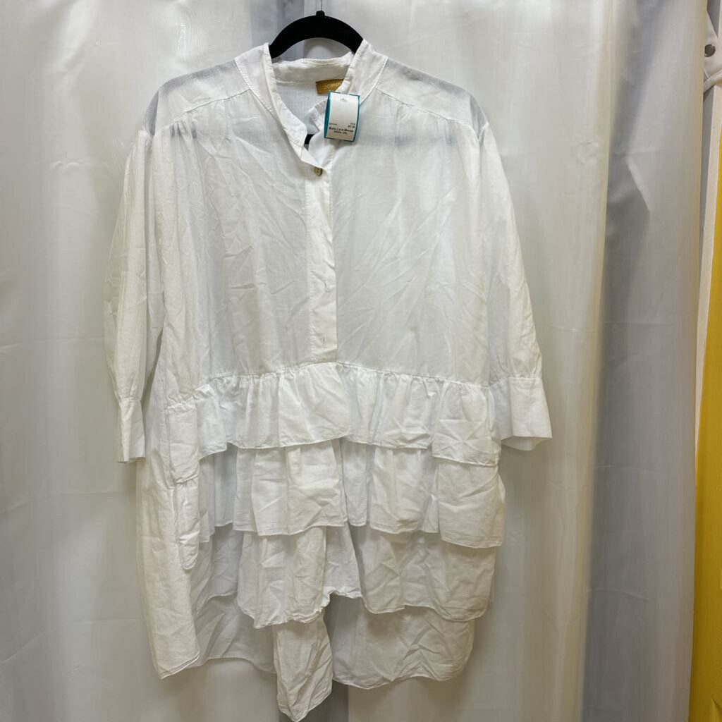 3/4 sleeve pull over white cotton blouse with ruffle front and shell buttons.