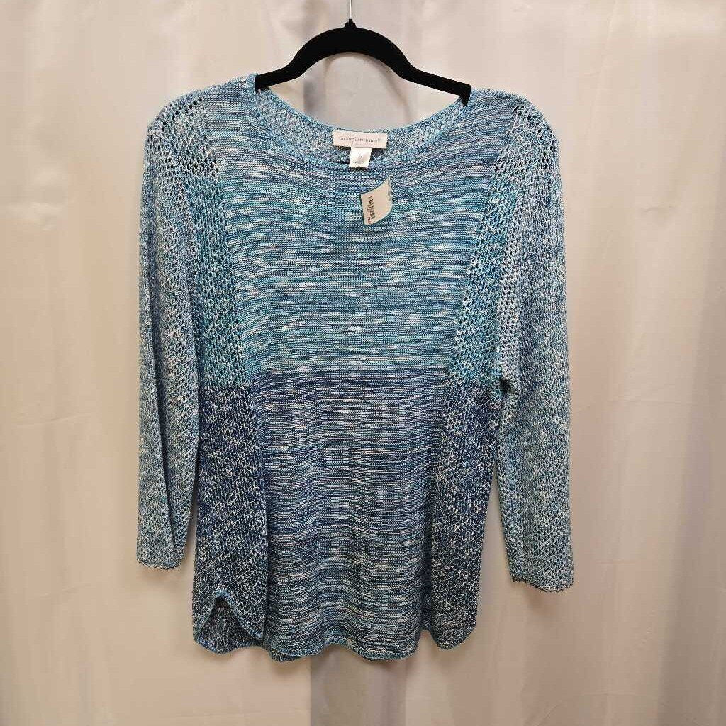 3/4 sleeve space dyed pull over open weave knitted sweater with scoop neckline.