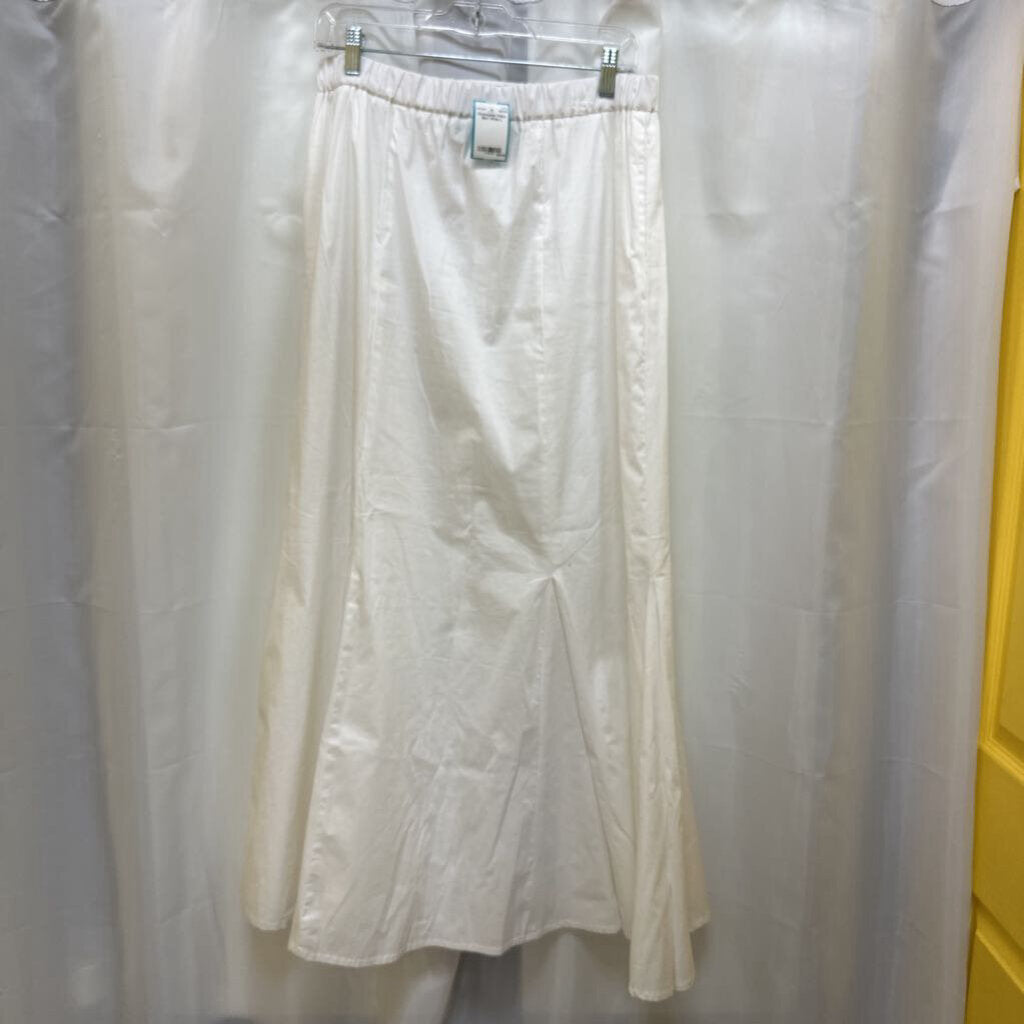 Long maxi white woven skirt with godets and pull on elastic waistband.