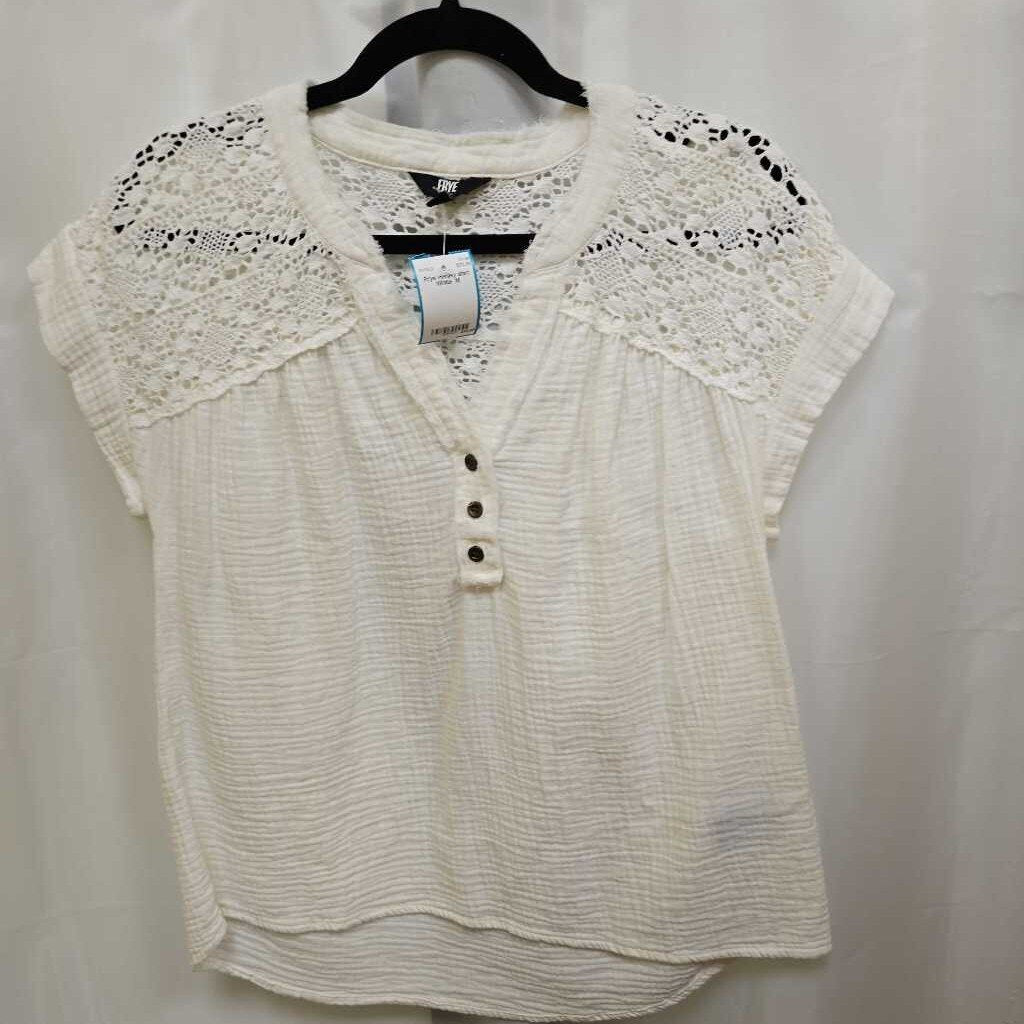 Short sleeve pucker cotton pull over Henley style shirt with button neckline, raw edges, and crochet trim.
