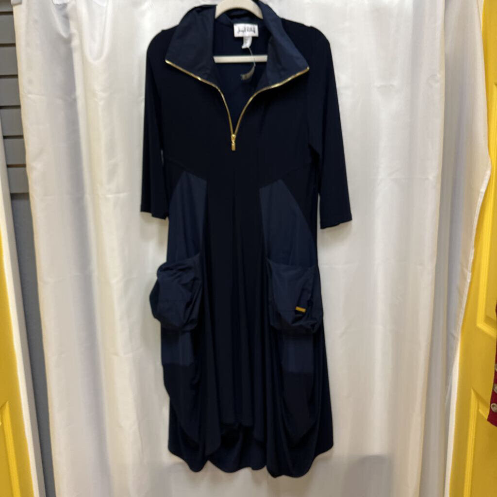 3/4 sleeve knit and nylon midi length dress with front gold zipper neckline and large 3D front pockets.