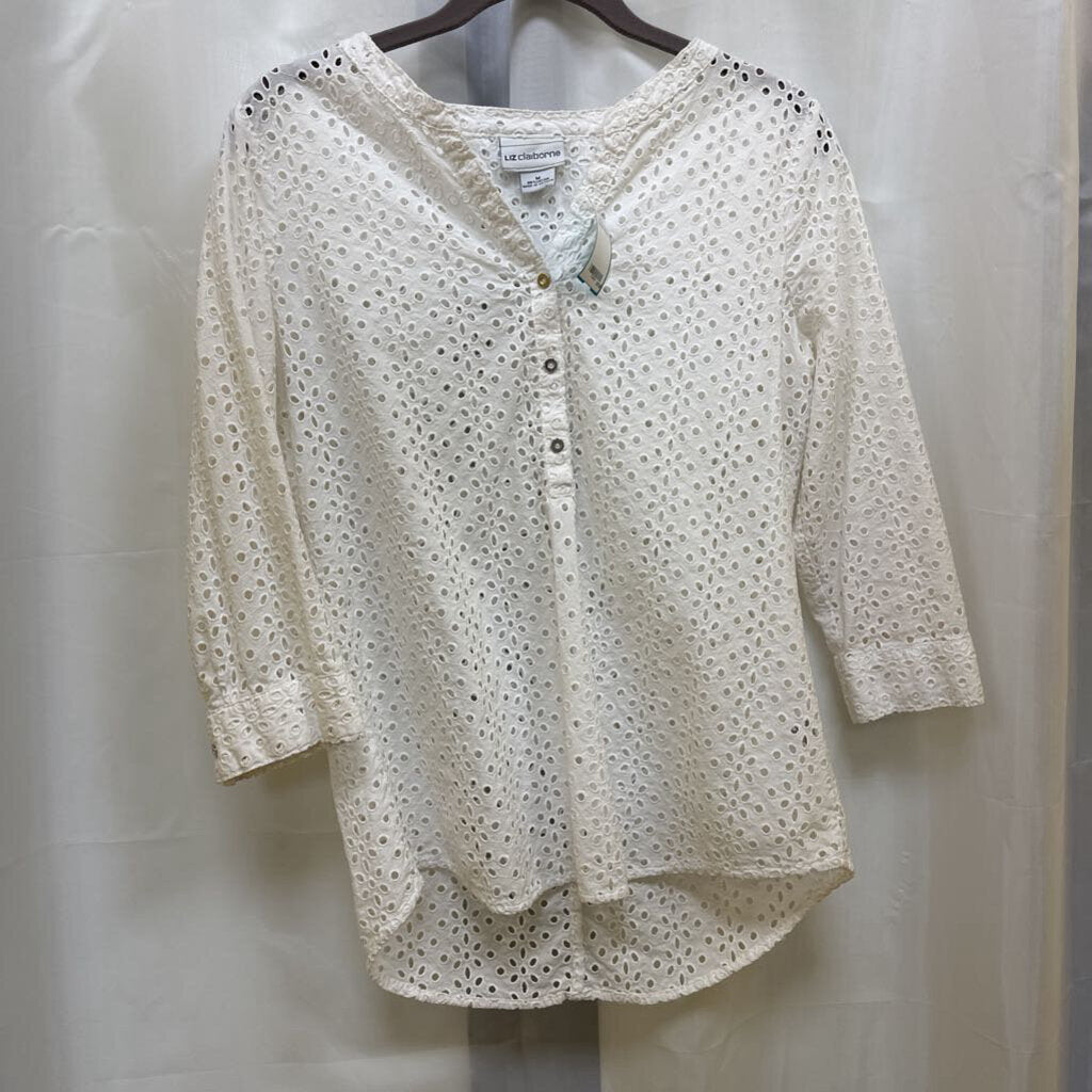3/4 sleeve pull over sheer woven all over eyelet blouse with button neckline.