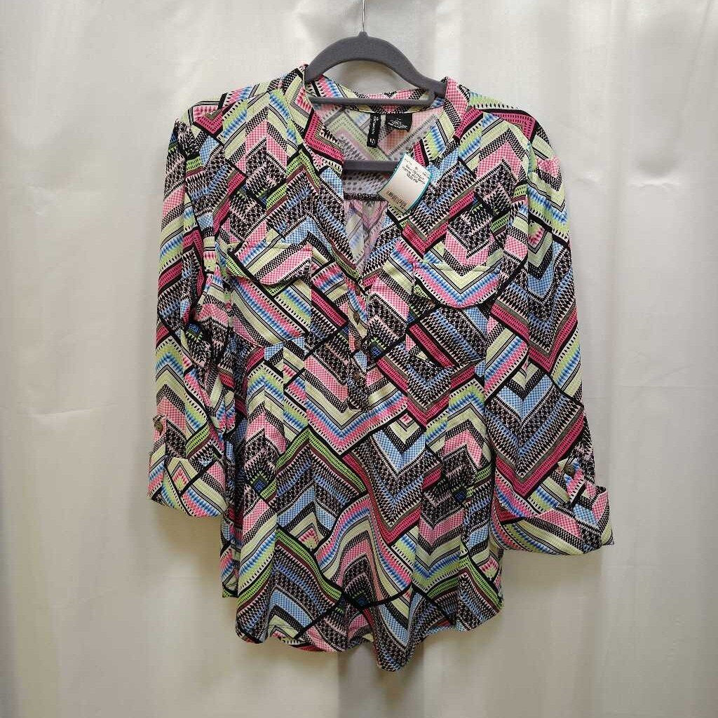 3/4 sleeve chevron printed short Henley style shirt with two front pockets and button neckline.