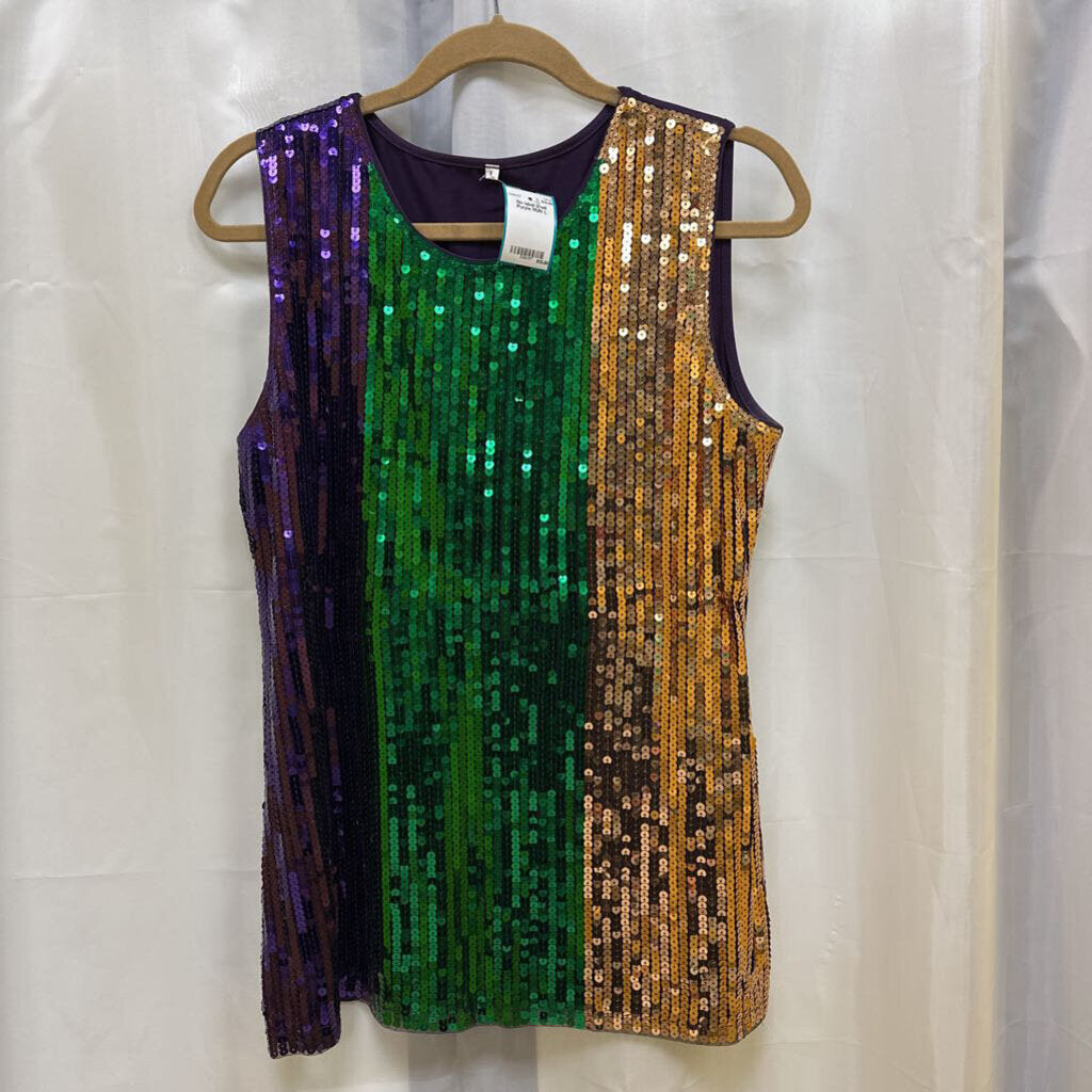 Sleeveless purple, green, and gold sequin pull over knit shell.
