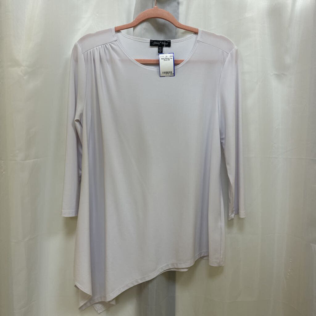3/4 sleeve pull over knit tee with scoop neck and asymmetric hem.