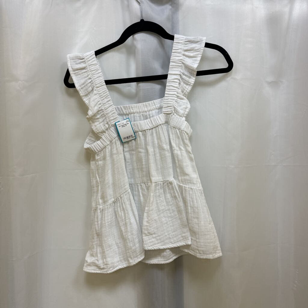 Sleeveless cotton crinkle solid pull over woven tank blouse with ruffle peplum and shoulder details.