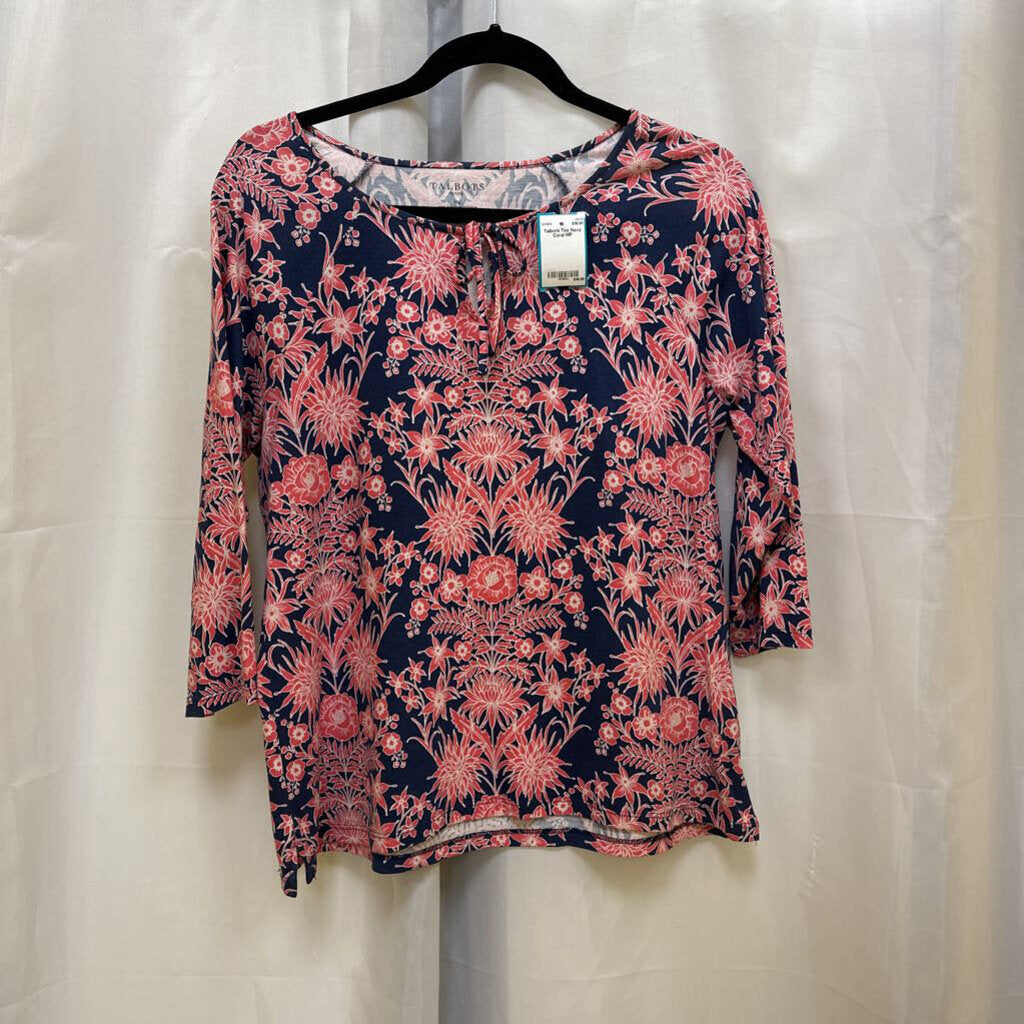 3/4 sleeve floral printed pull over knit tee with scoop tie neckline.