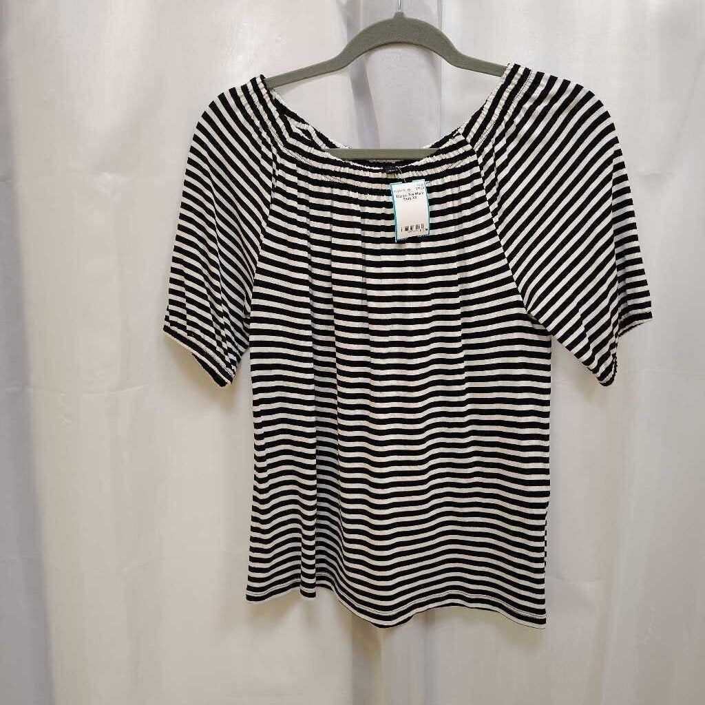 Short raglan sleeve stripe printed pull over knit tee with elastic neckline.