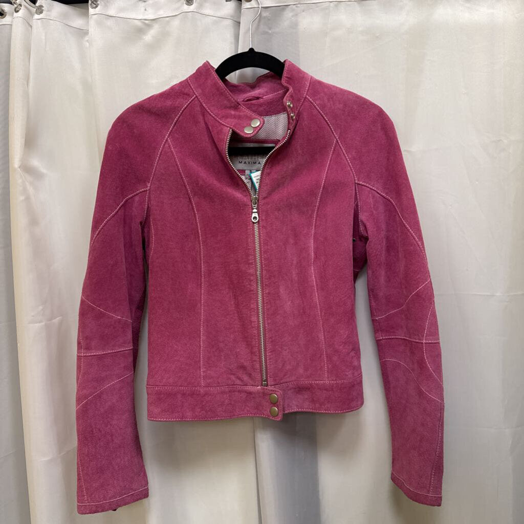 Long sleeve rose pink solid suede short zip front jacket with contrast stitching and mesh lining.