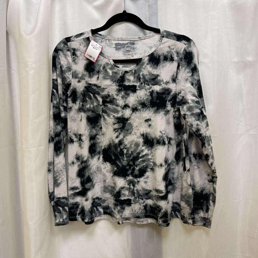 Long sleeve tie dye printed pull over knit t- shirt with peek a boo neckline.