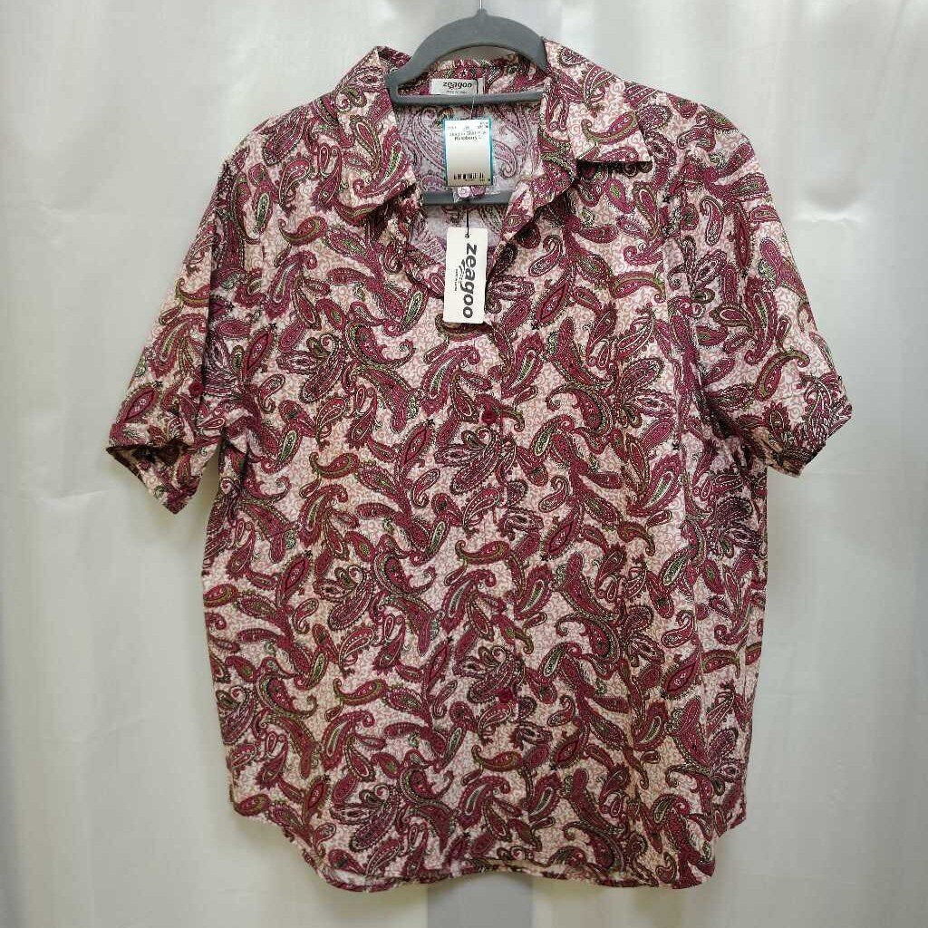 Short sleeve paisley printed button front woven shirt with collar and cuffs, new with tags.