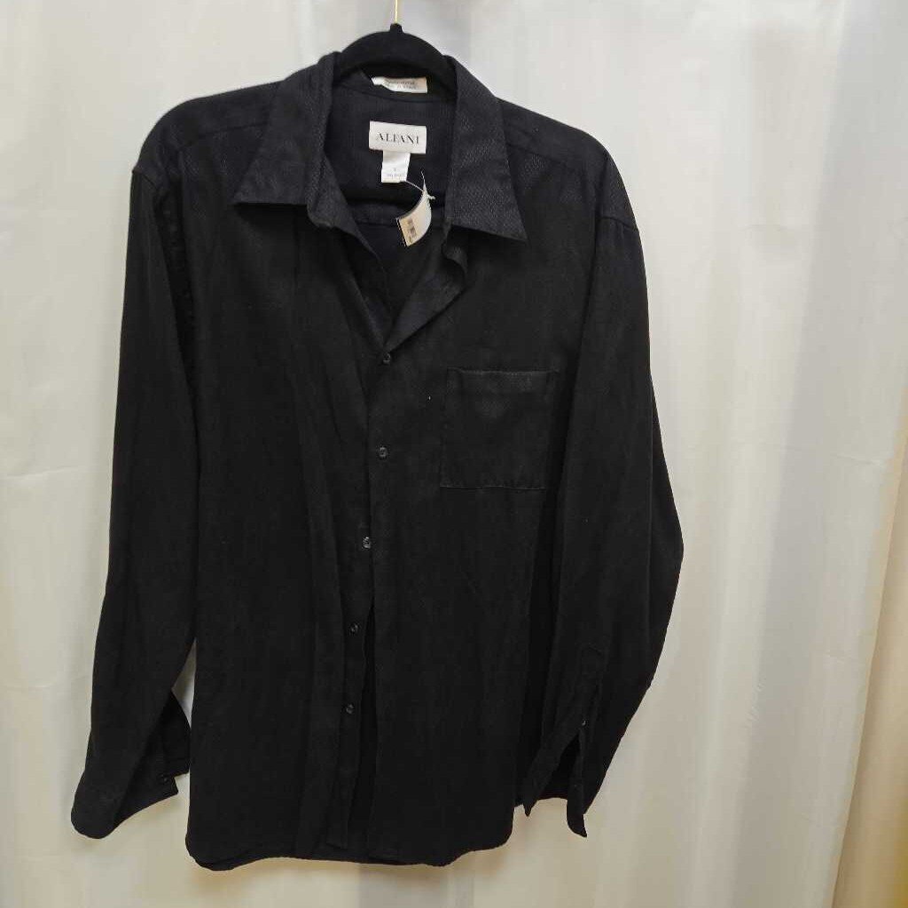 Long sleeve black perforated men's button down shirt with one front pocket.