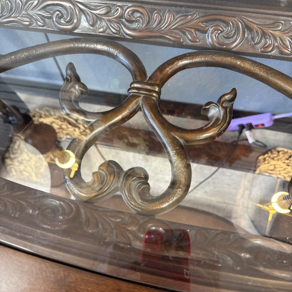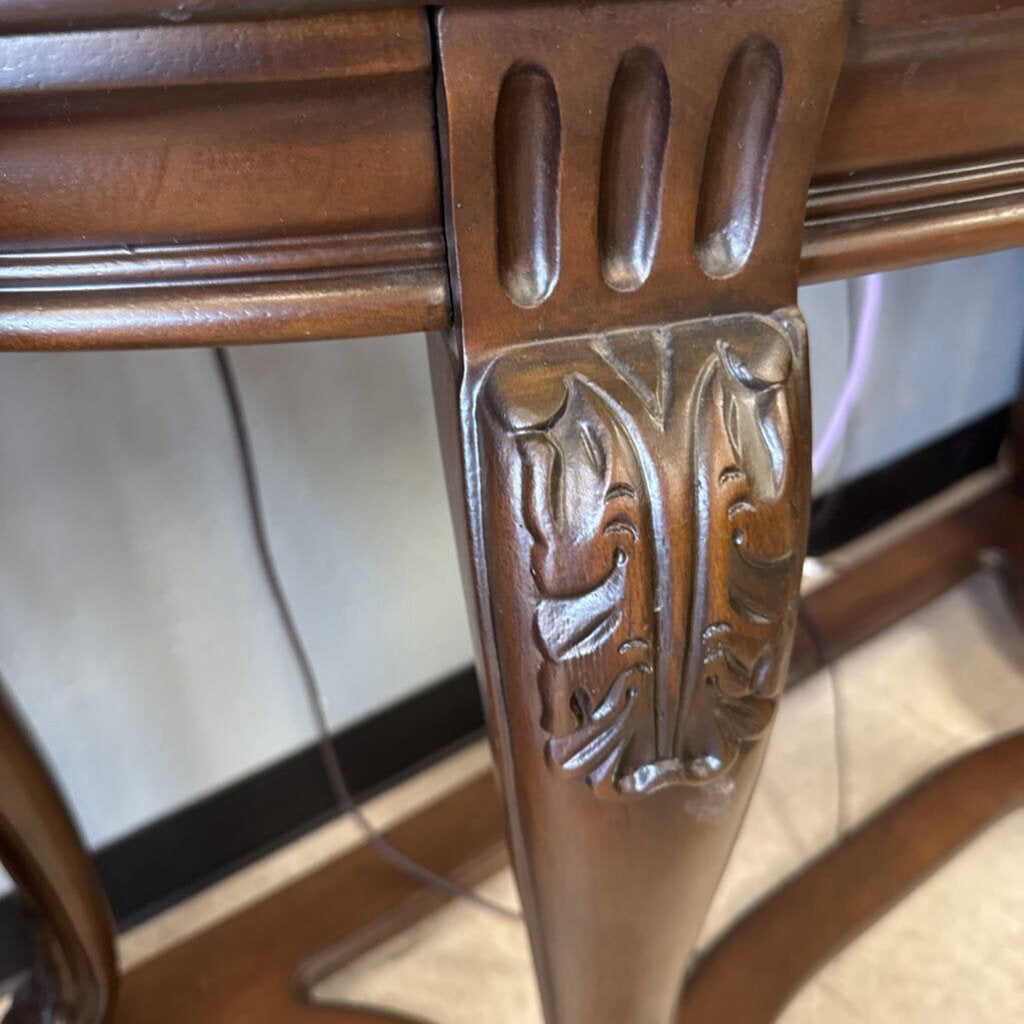 half circle entry or sofa table with glass inset; scroll work style braces and legs