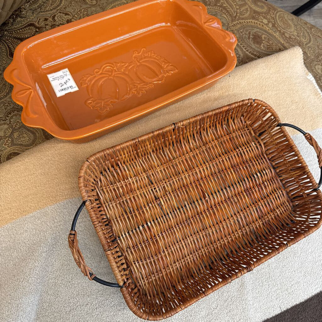 ceramic baking dish embossed with pumpkins; tab style handles; includes wicker basket/trivet