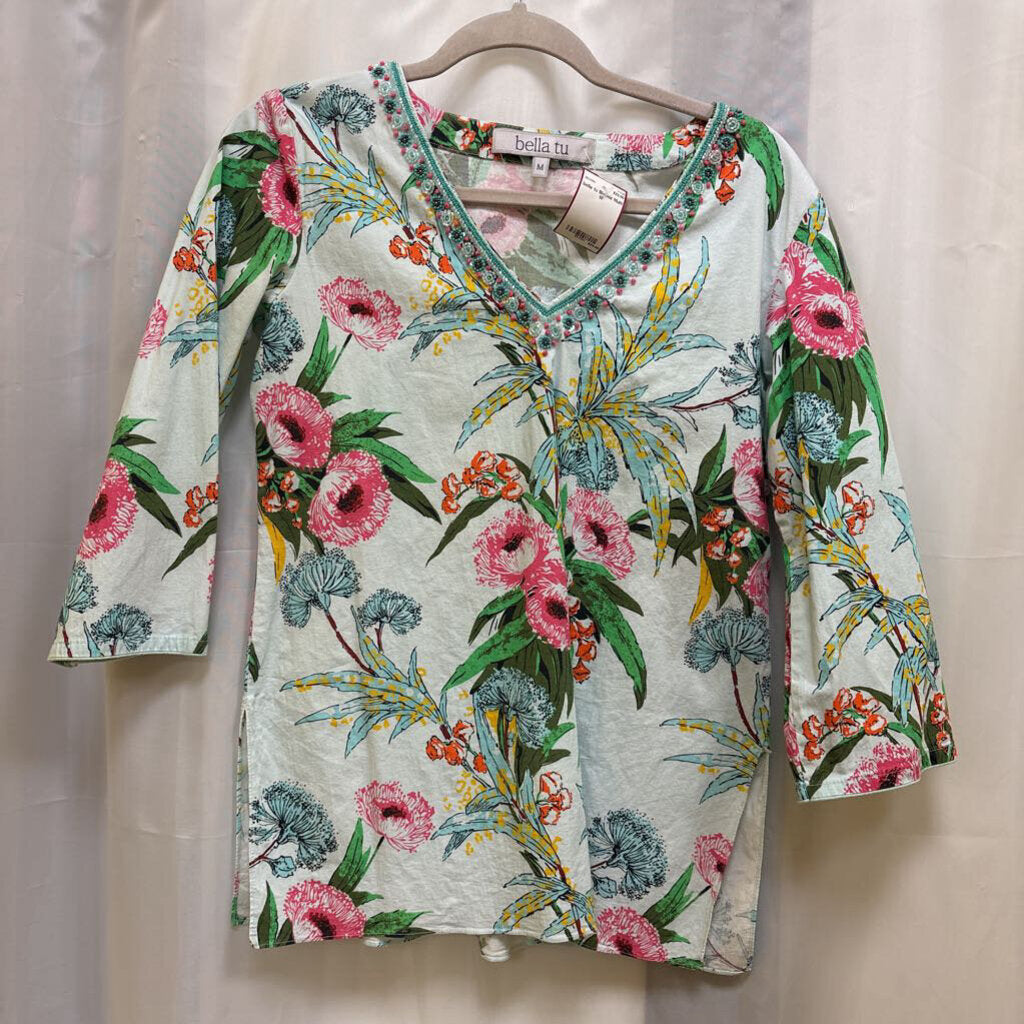 Pull on, vneck with bead work, 3/4 sleeves, green/pink/yellow/blue/orange flower design. Falls past waist.