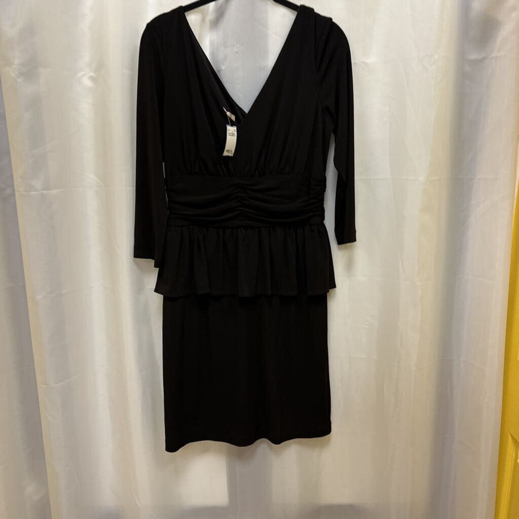 3/4 sleeve black knit short dress with low V- front and back neckline and peplum.