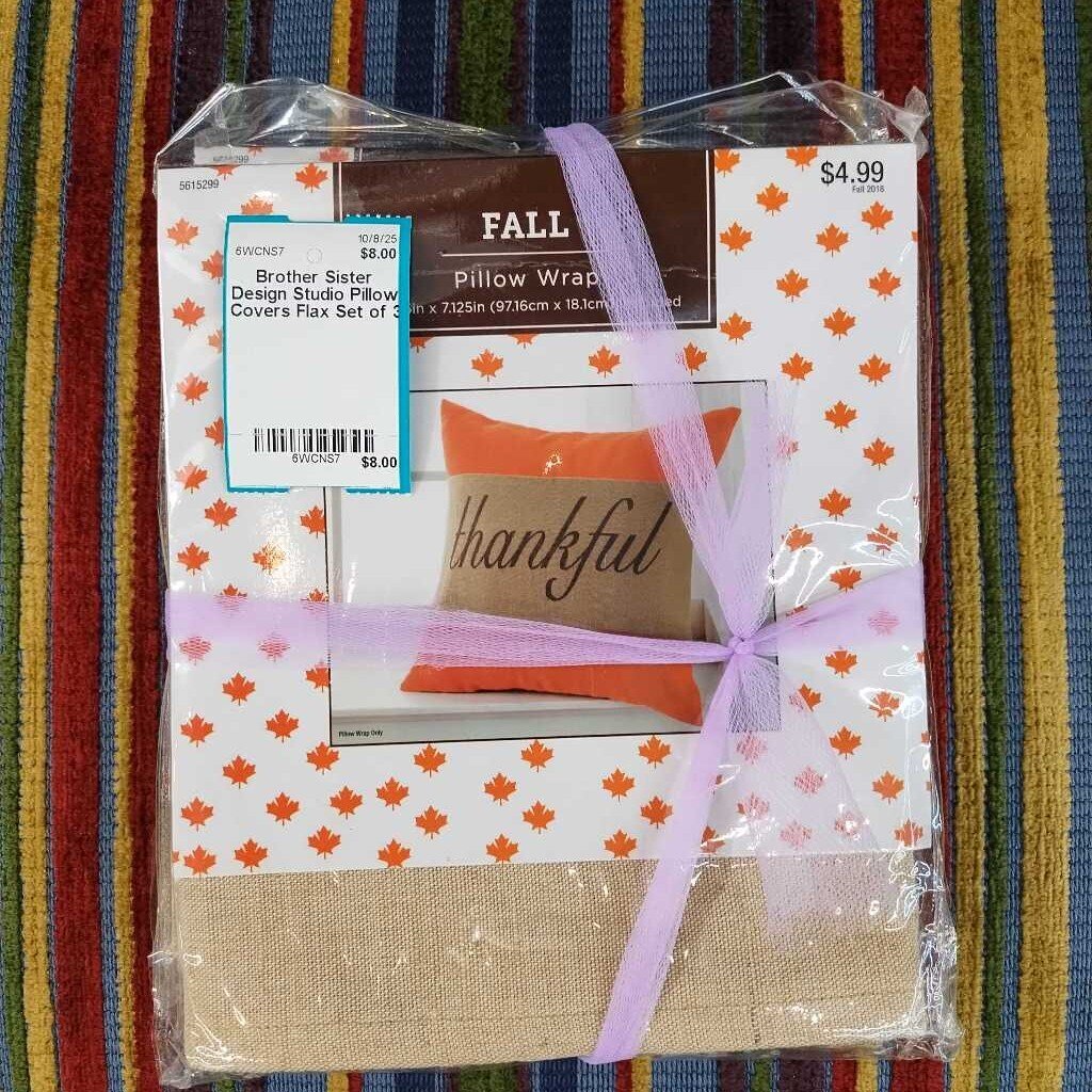Set of three, in plastic, fall pillow covers, two say "Thankful" and one says "Blessed".