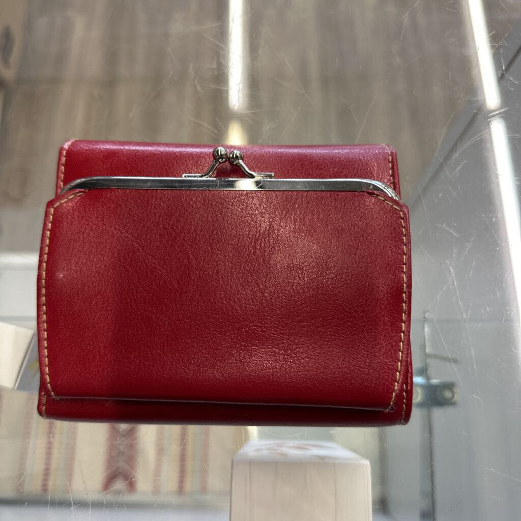 Red leather Buxton wallet with coin purse attached and snap front closure.