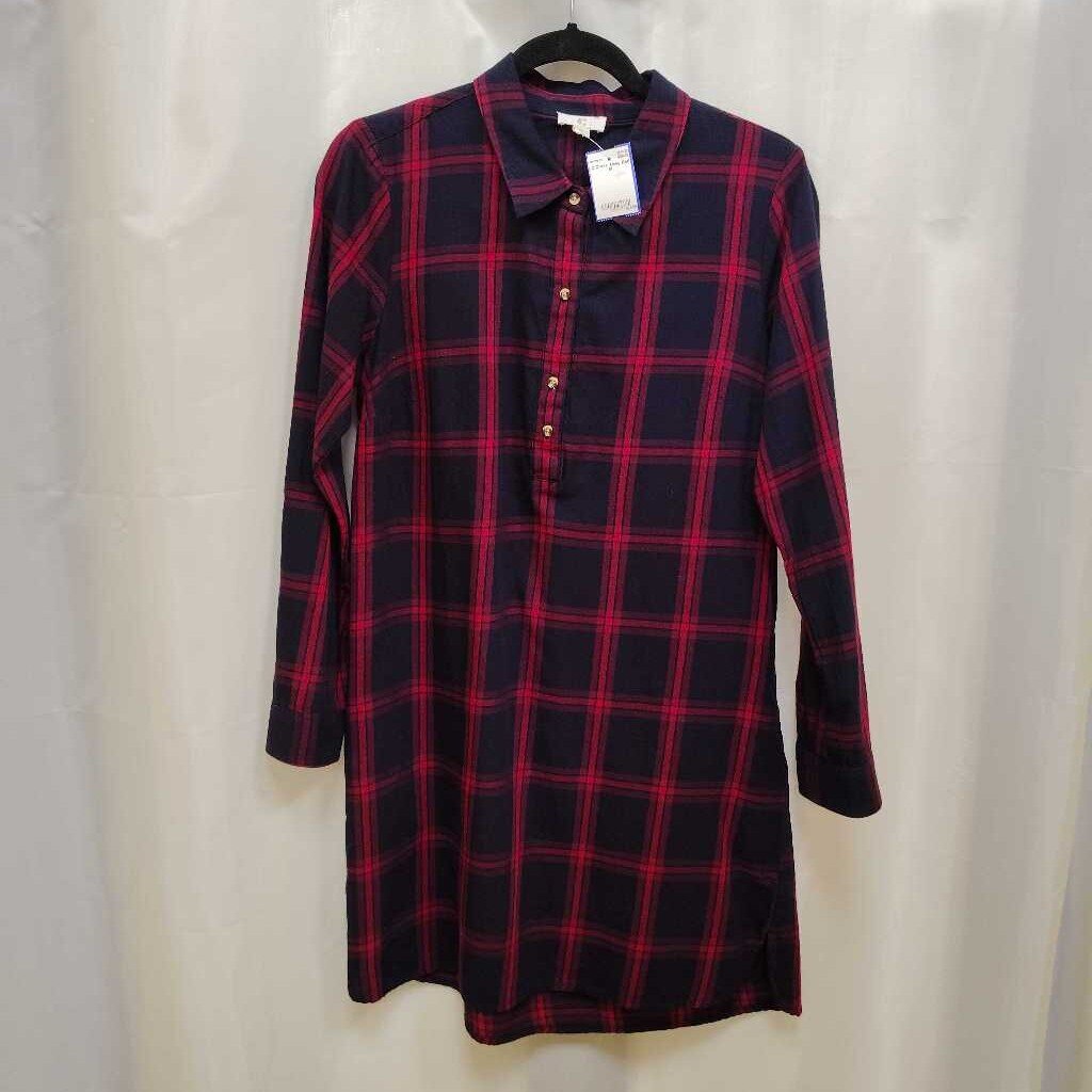 Long sleeve plaid printed pull over woven shirt dress with button neckline.