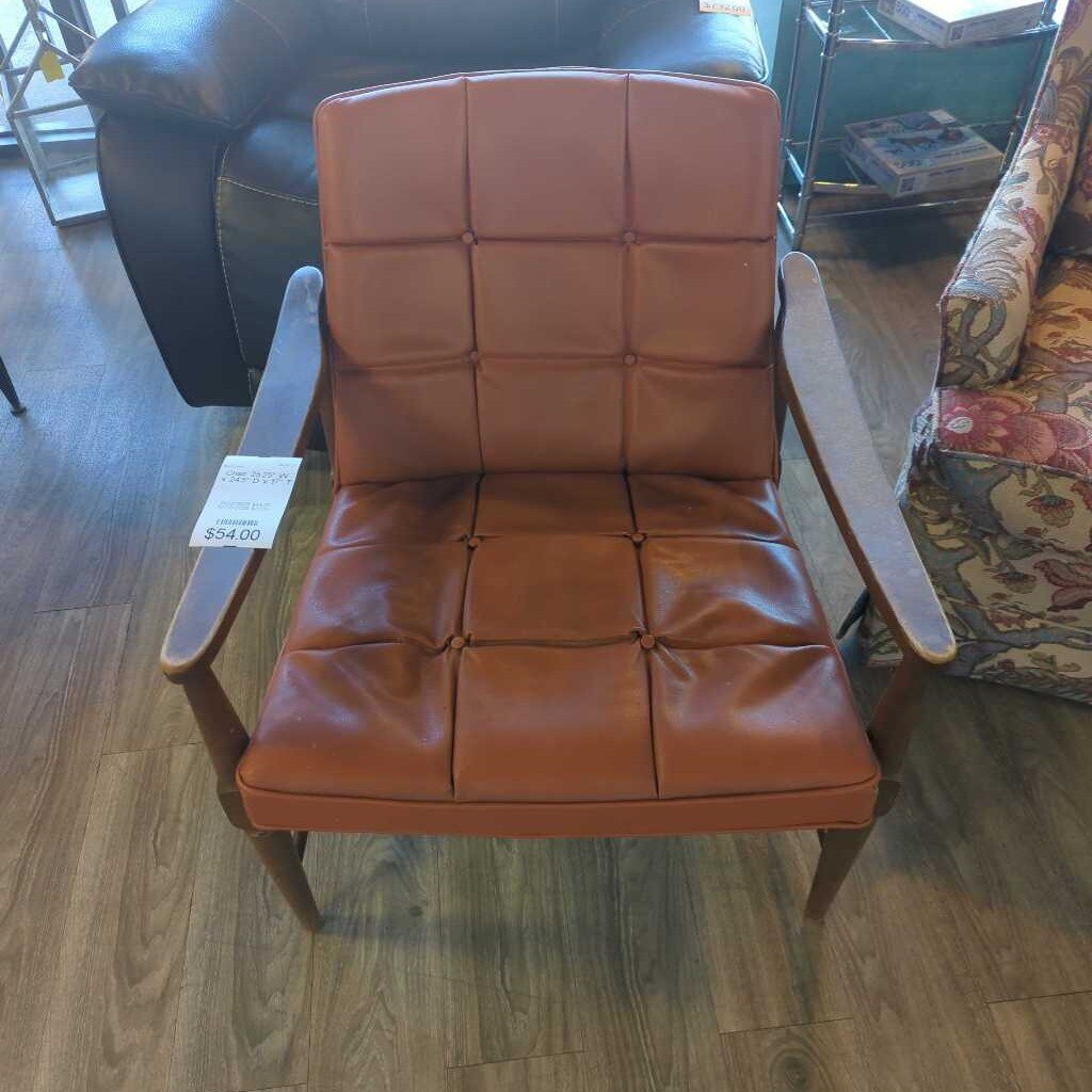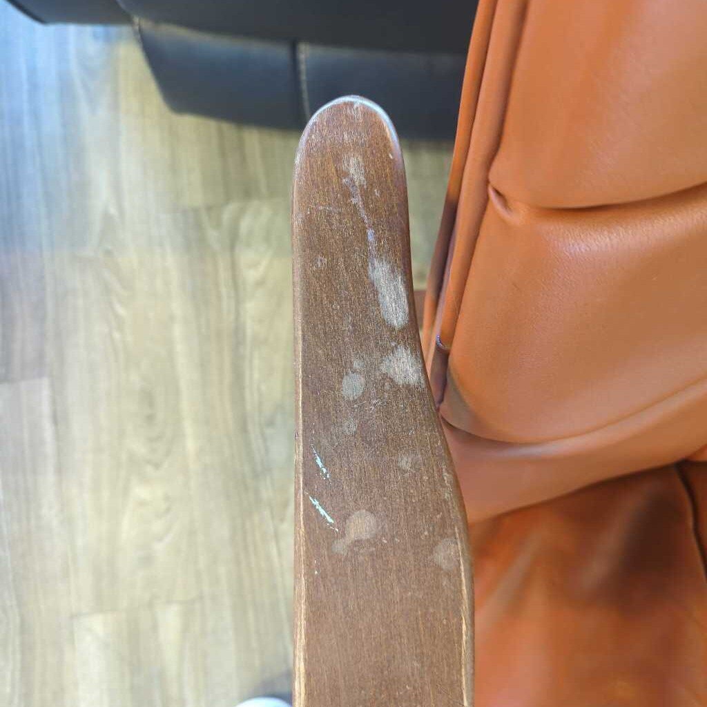 Wood framed chair with faux leather seat and seat back. There is some damage to the arms.