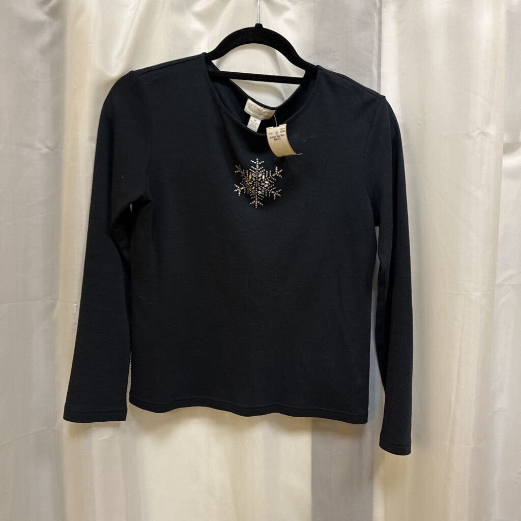 Long sleeves, pull on, round neck, bling snowflake on front. Falls past waist.