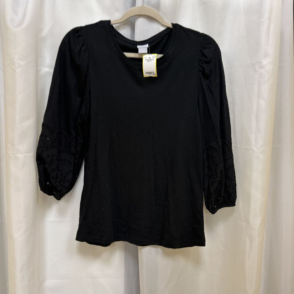 Pull on, round neck, 3/4 sleeves with cut out design at cuff. Falls past waist.