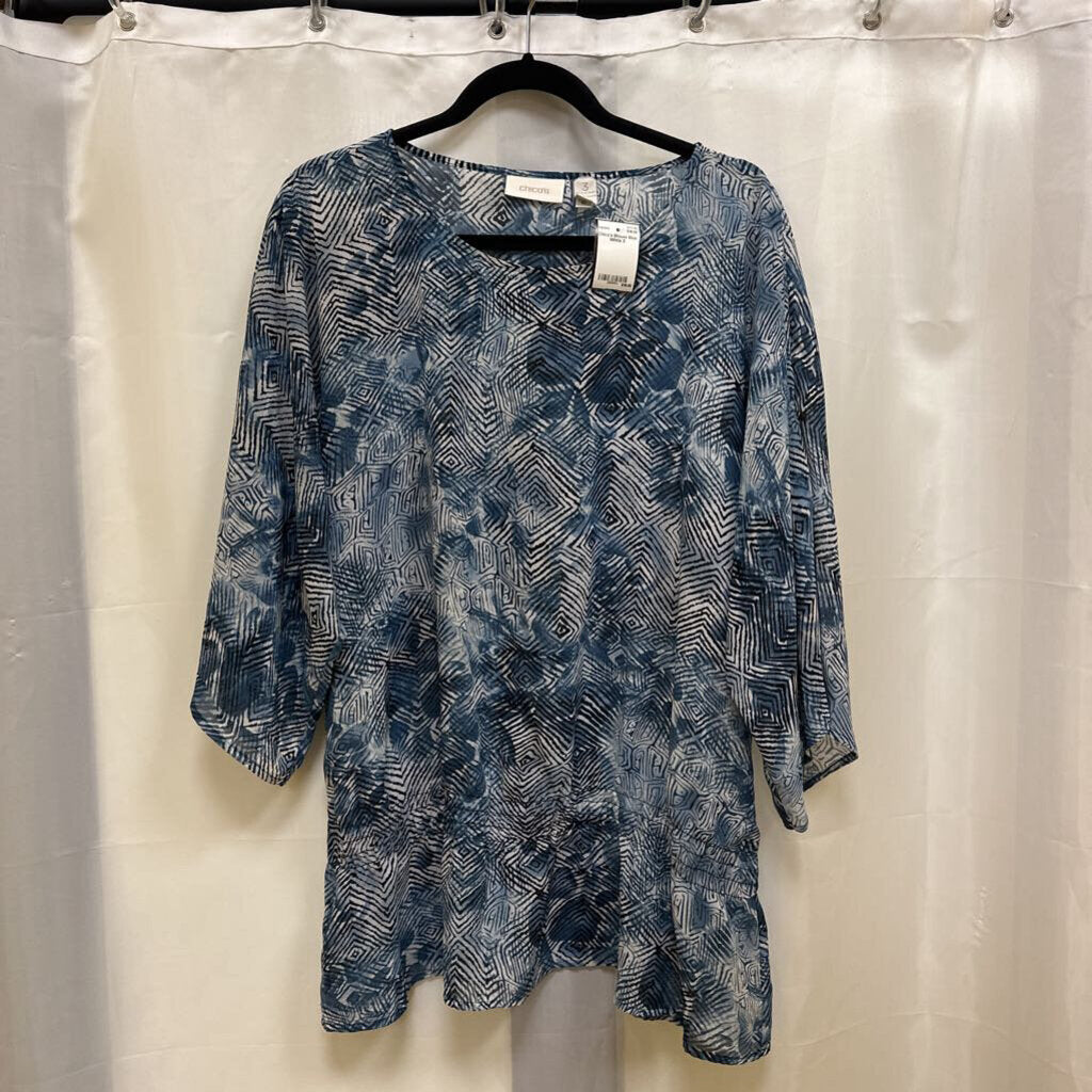 3/4 sleeve abstract geometric printed sheer pull over woven blouse with scoop neckline.