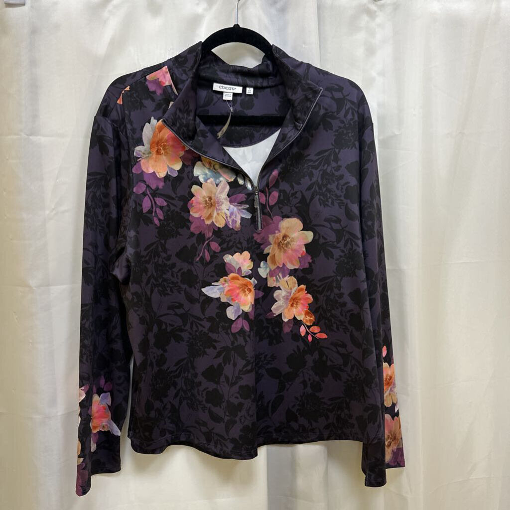 Long sleeve pullover with zip at neckline , black flowers in the background , purple background flowers , flowers with orange and pink