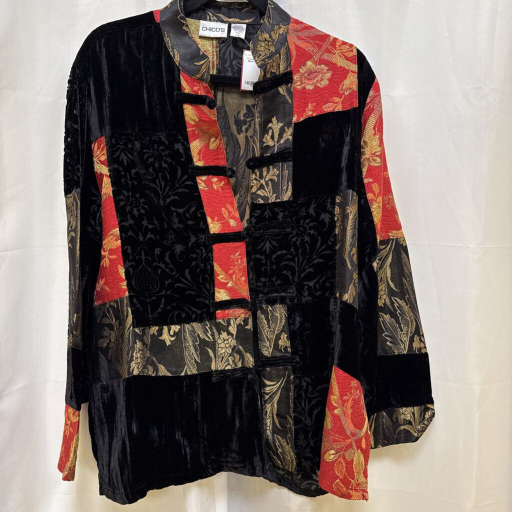 Long sleeve frog and loop front black, orange, and gold patchwork jacket.
