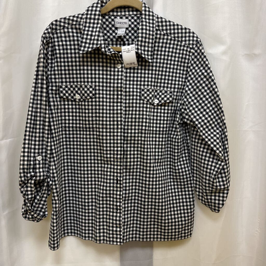 Long sleeve check printed button front shirt with adjustable sleeves and two front pockets.