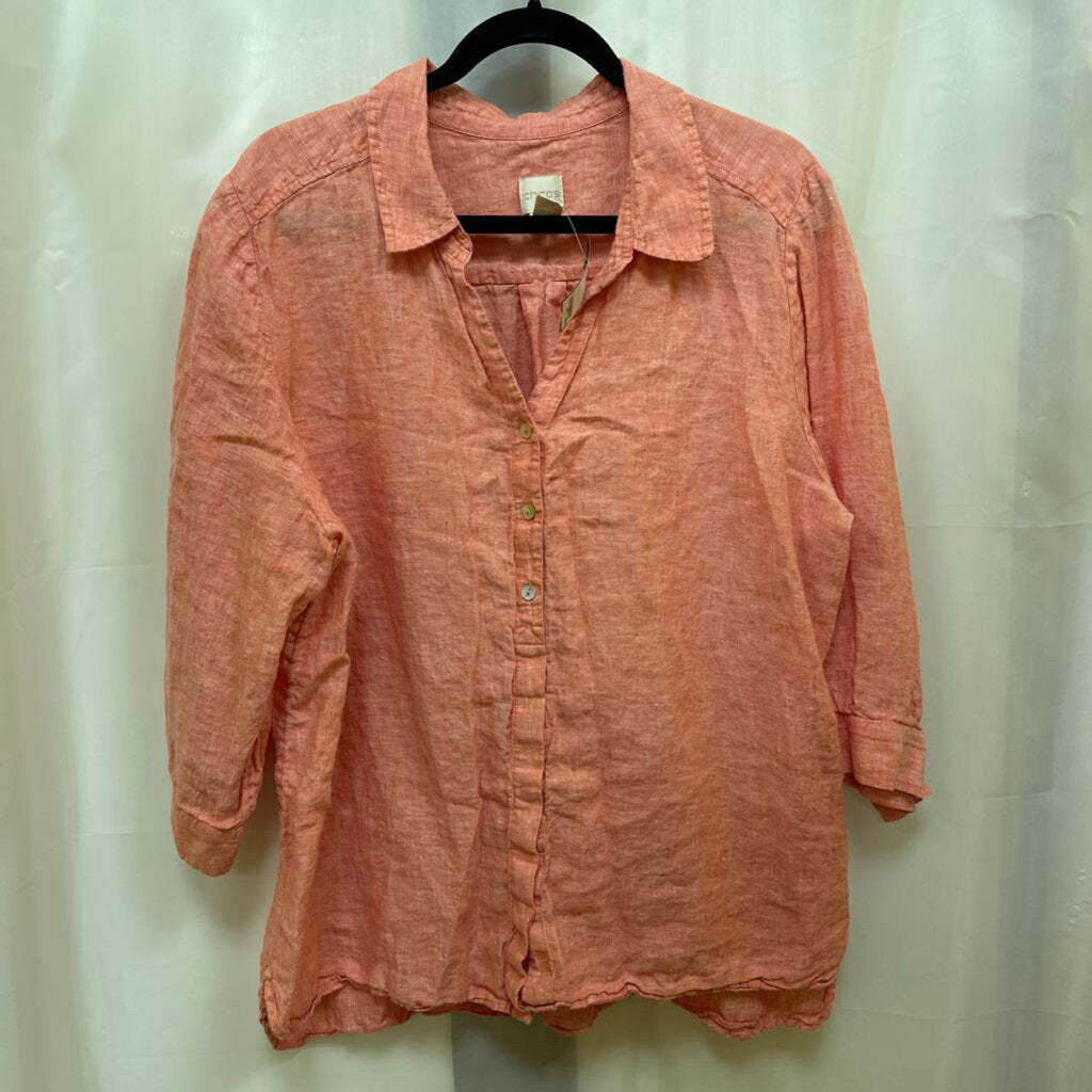 3/4 sleeve button front linen shirt with V- neck with collar and cuffs.