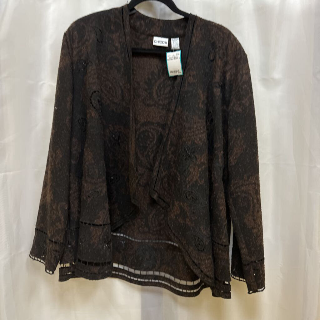 Long sleeve knit hip length with open weave accent , brown paisley , black beading