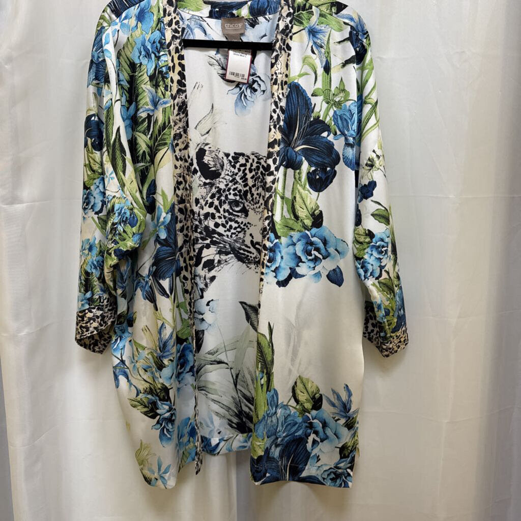 3/4 sleeve pull on woven shrug with floral and cheetah print. It has a matching tee sold separately.