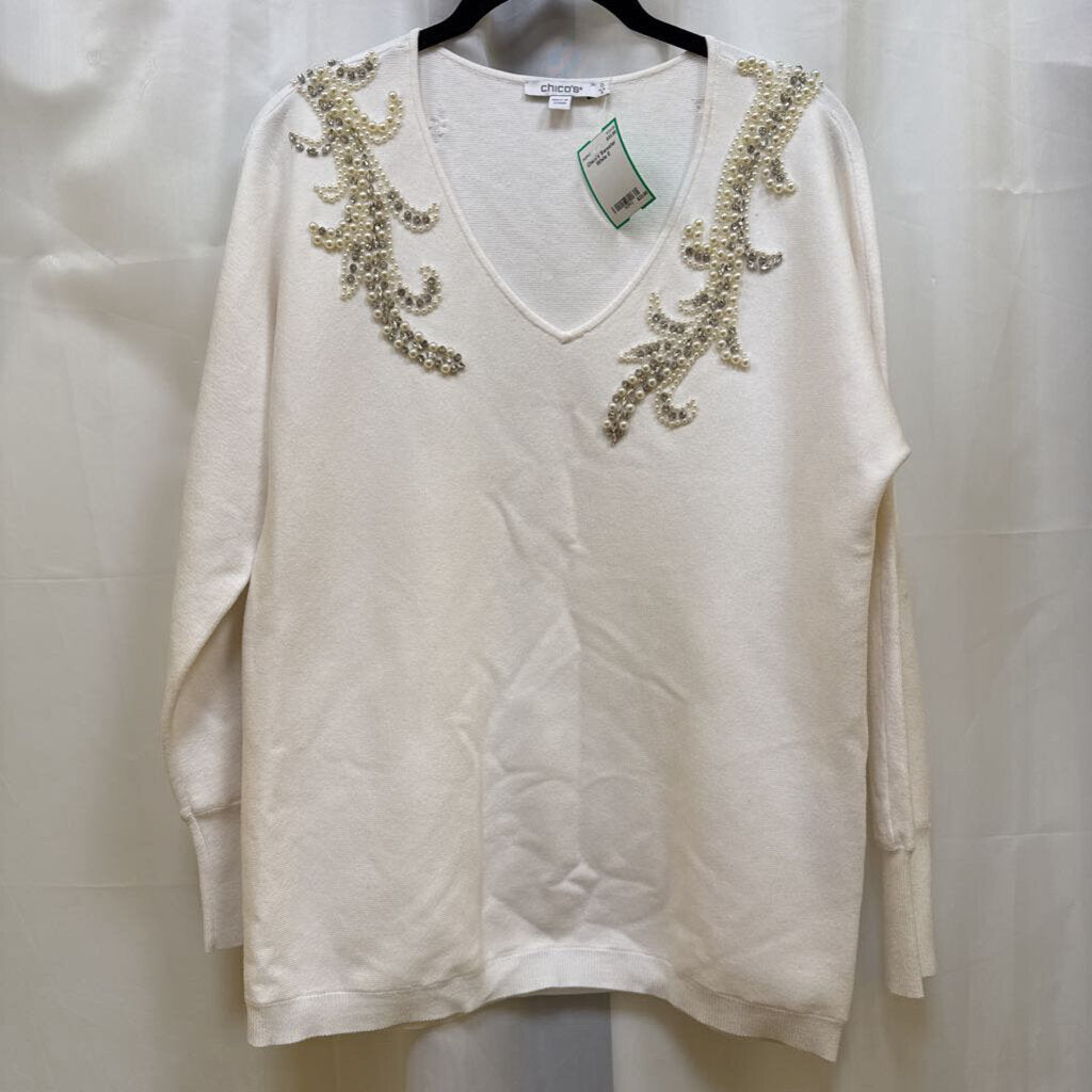 Long sleeve pull on knitted sweater with low V- neckline and pearl and rhinestone trim at shoulders.