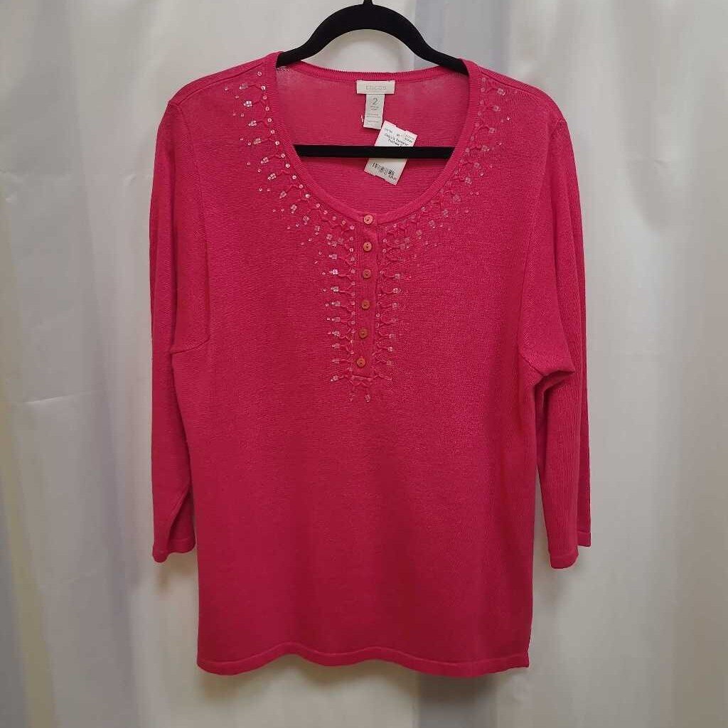 3/4 sleeve solid knitted pull over sweater with button scoop neckline and beaded trim accents.