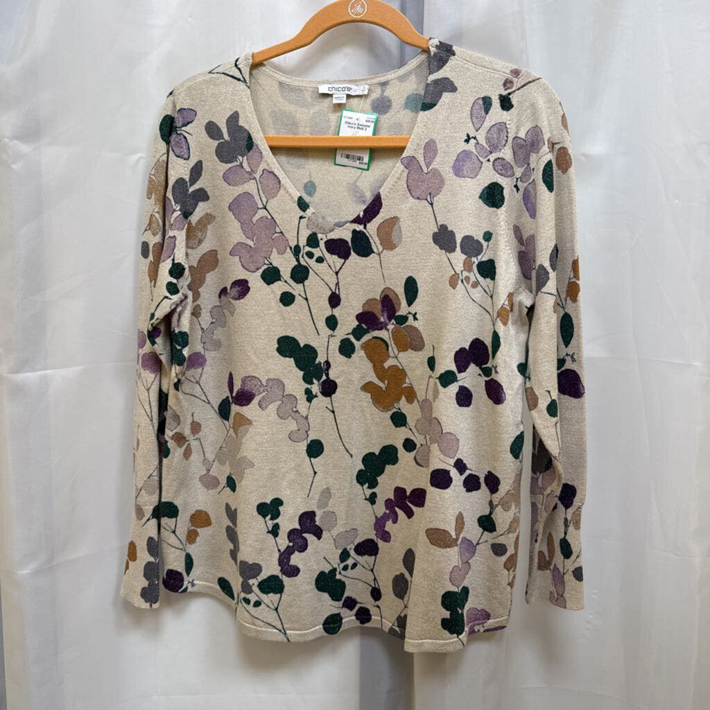 Long sleeve pull over sweater with watercolor flowers and stems print and V- neckline.