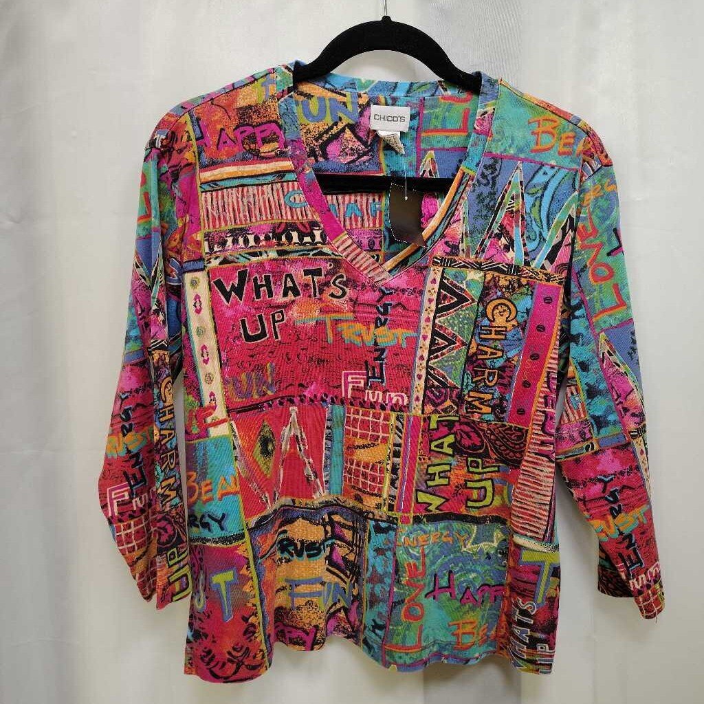 3/4 sleeve graffiti printed pull over t- shirt with V- neckline.