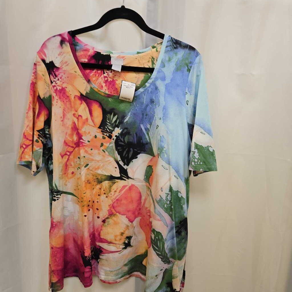 Short sleeve watercolor floral printed pull over knit t- shirt with scoop neckline.