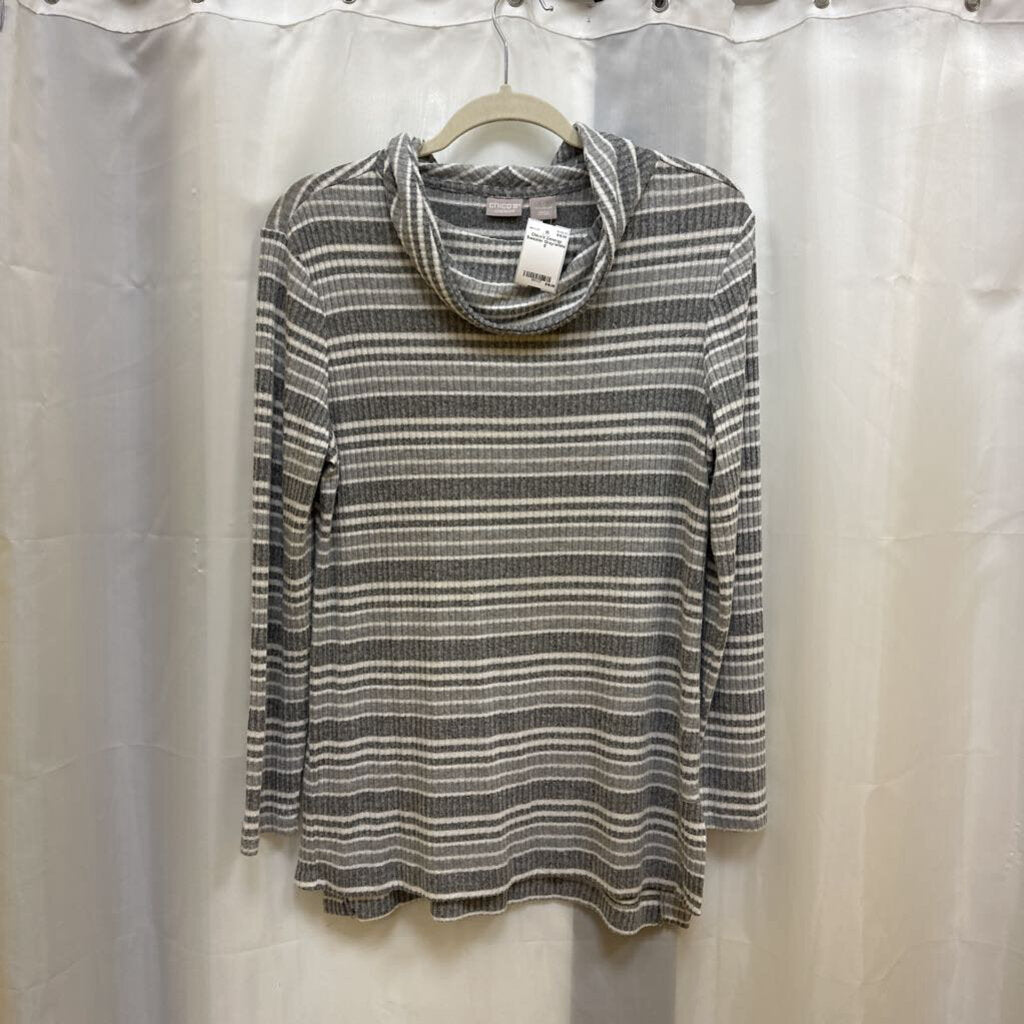 Pull on, long sleeves, cowl neck, striped. Falls past waist.