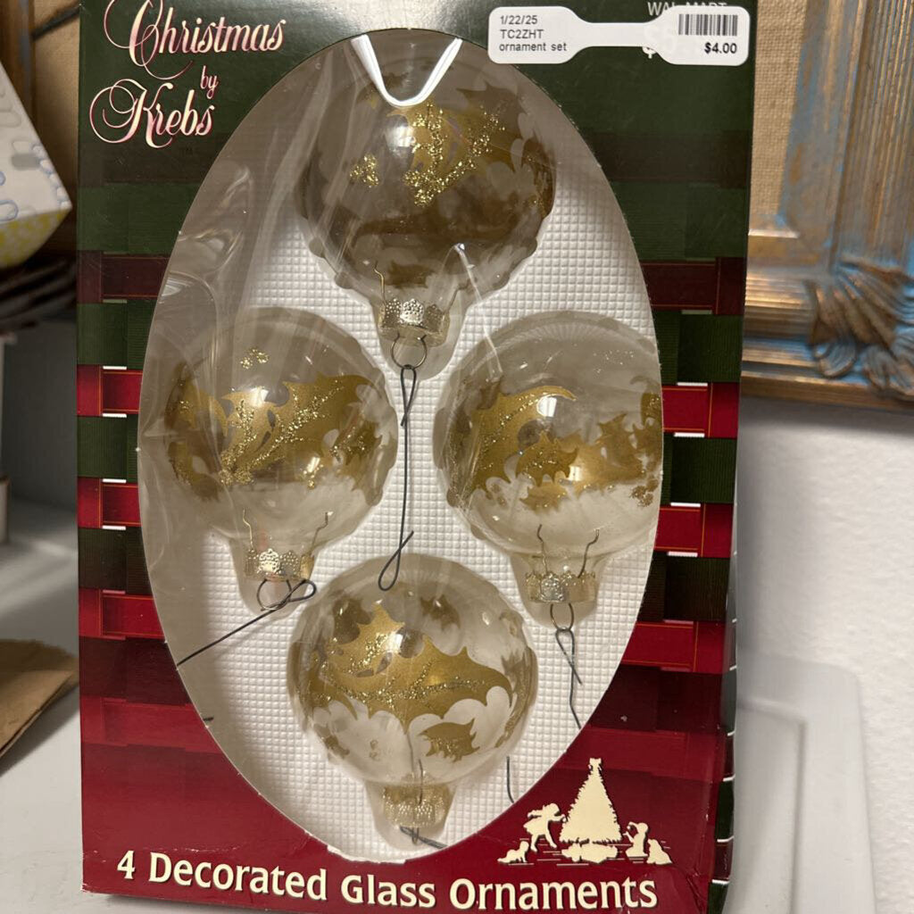 Set of 4 gold and clear ornaments.