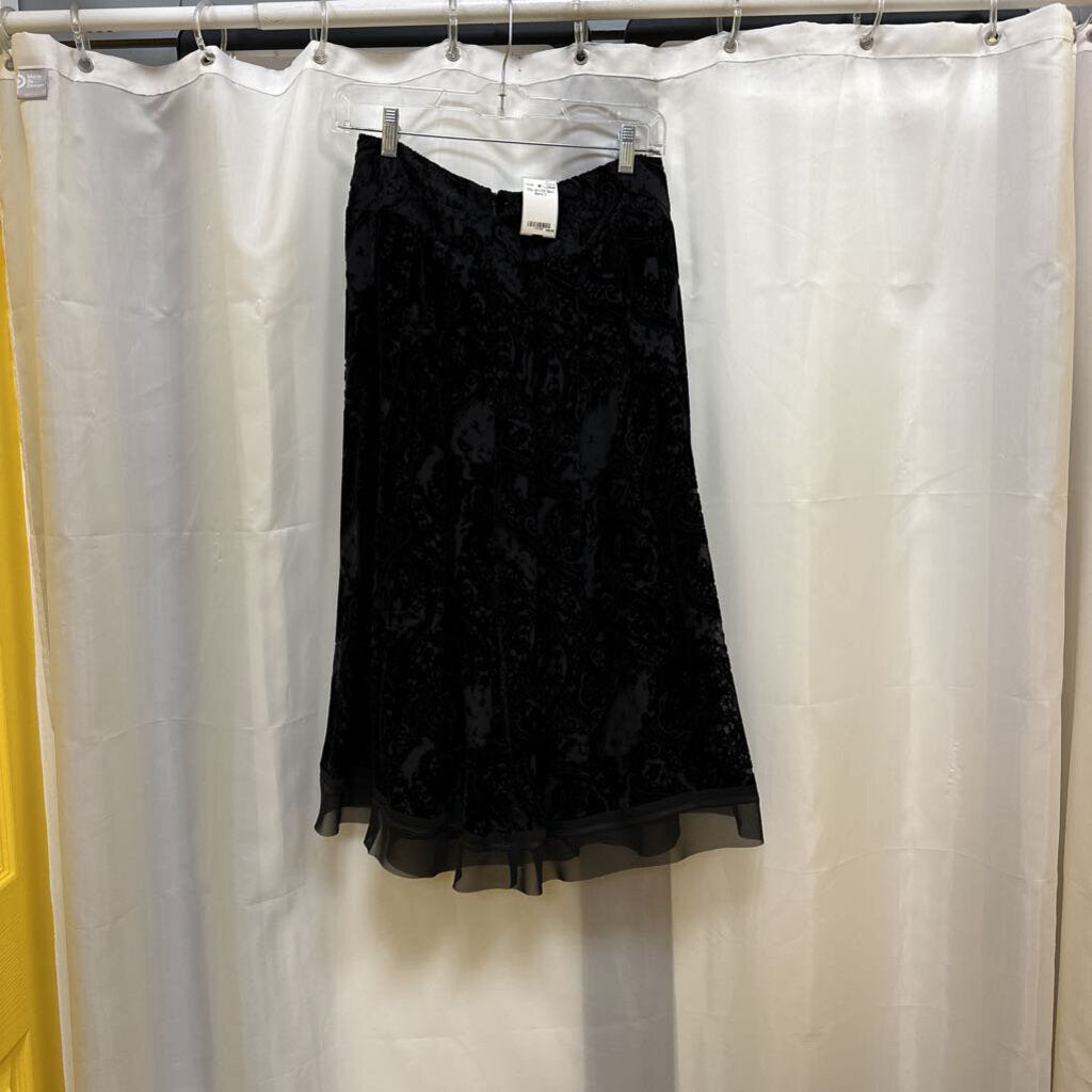 Zipper closure, lined, black velvet paisley design over slip. Falls to shin.