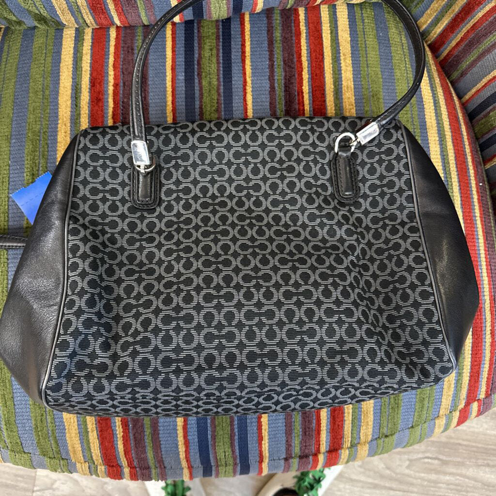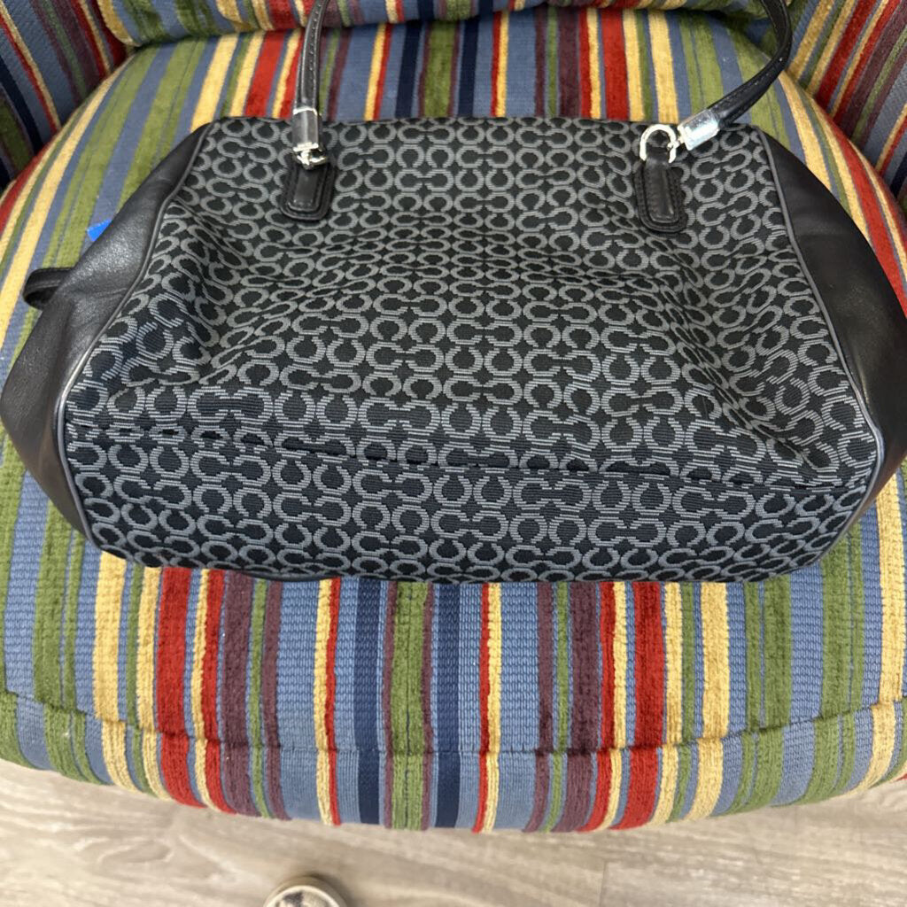 Black with blue inside. 1 snap pocket outside, zips closed.