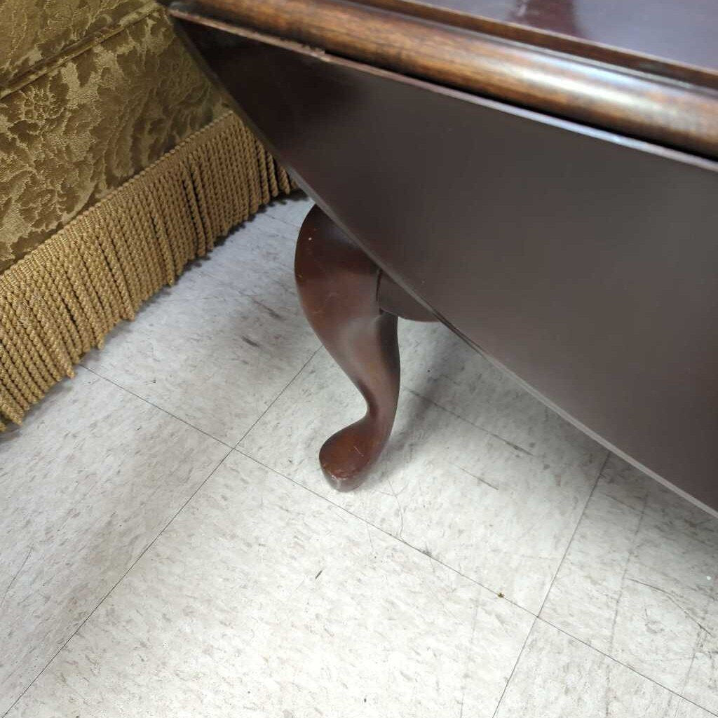 Has claw foot style legs and 2 leaves that can fold out to make coffee table larger and round.