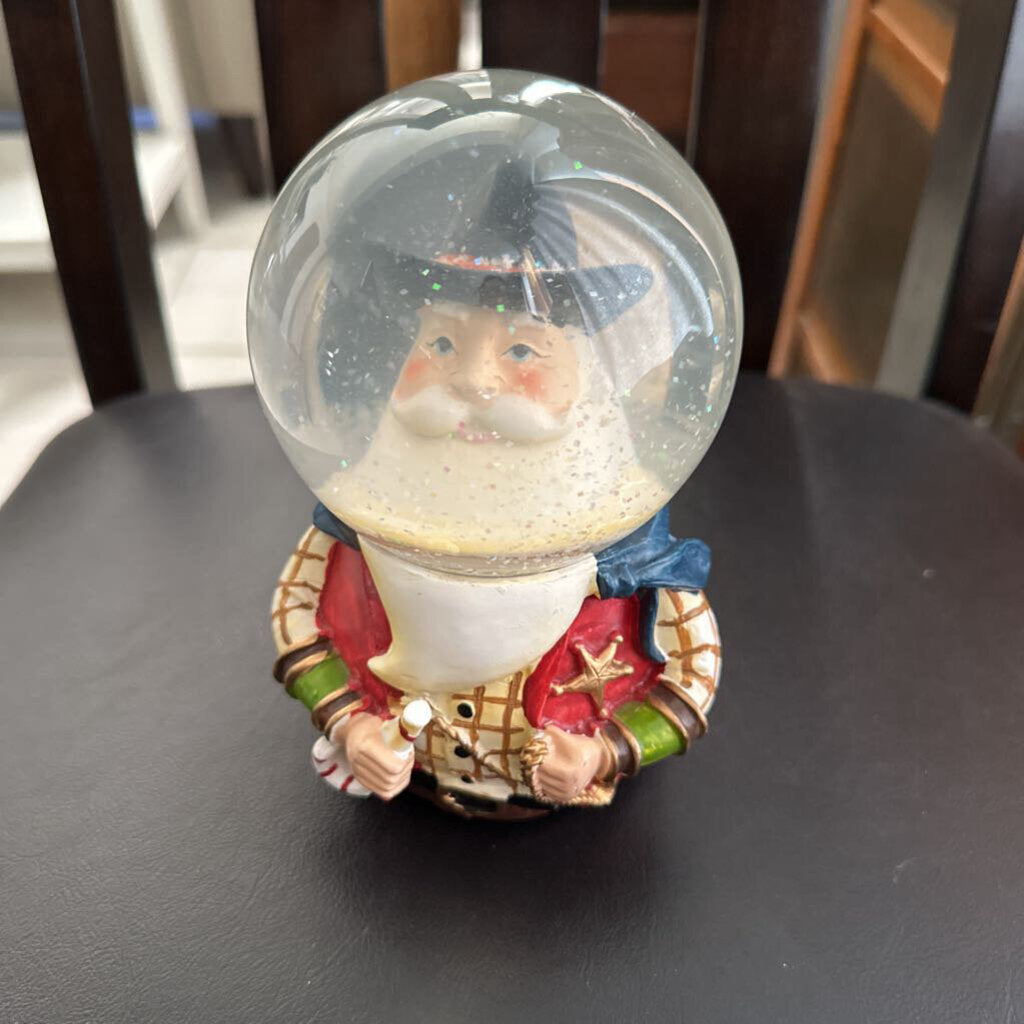 Cowboy head in a snow globe. Plays We Wish You a Merry Christmas Snow globe 7" x 5" Red multi