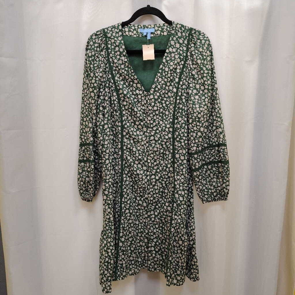 Slightly below knee , long elastic sleeve button front with small white flowers green lace accent