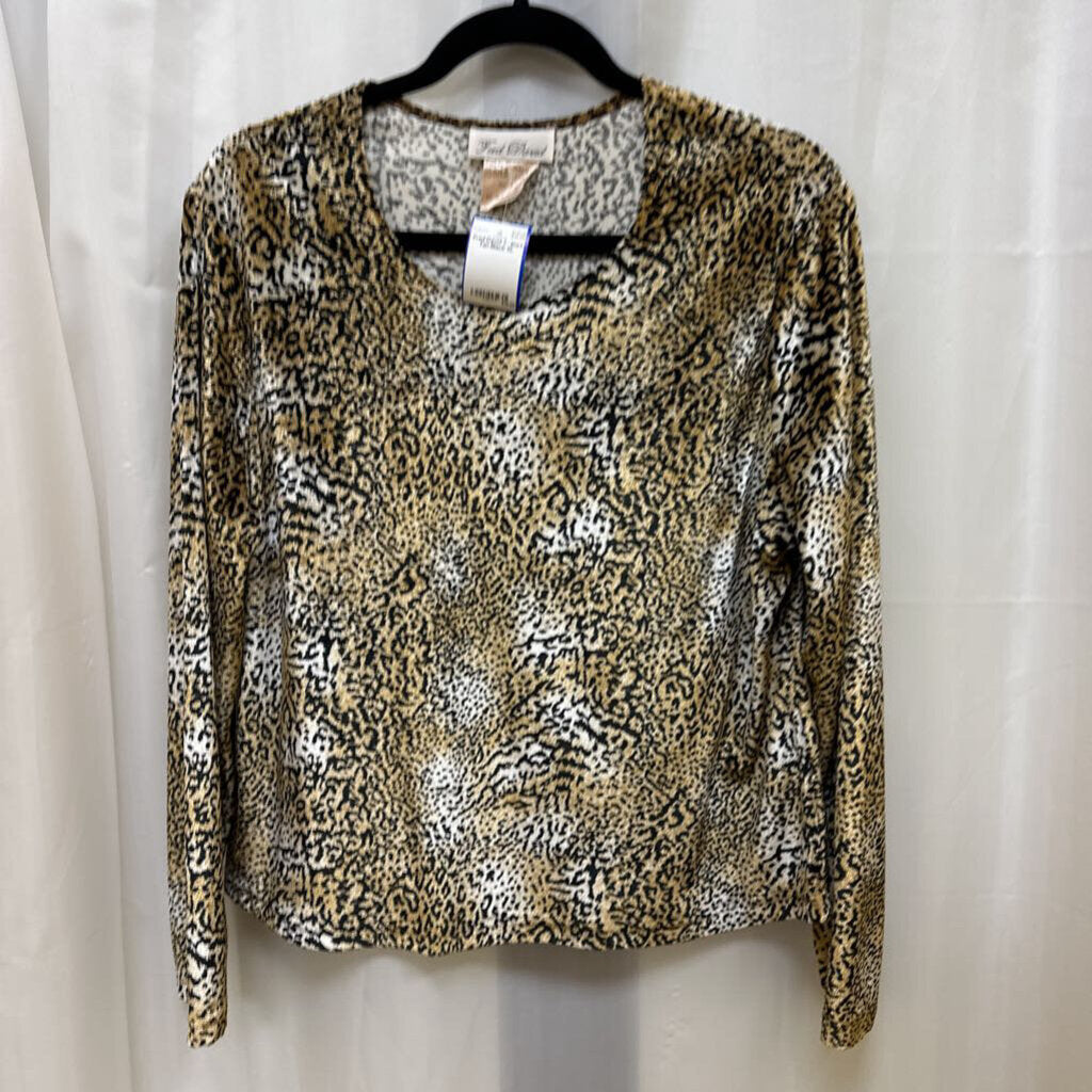 Long sleeve animal printed stretch velvet pull over t- shirt with scoop neckline.