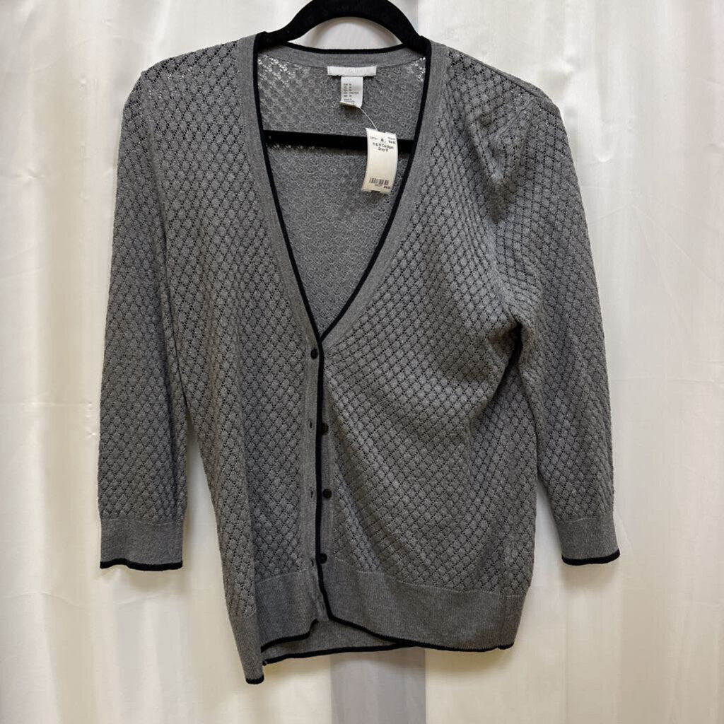 3/4 sleeve novelty knitted button front low V- neck cardigan with black banding detail.