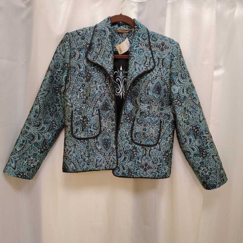 Long sleeve paisley jacquard hook and eye front boxy jacket with front patch pockets and shawl collar with contrast black piping detail.