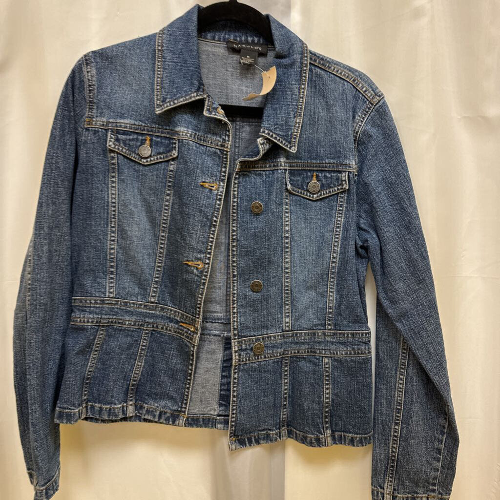 Long sleeve denim jacket with peplum hem, patch front pockets, and collar.